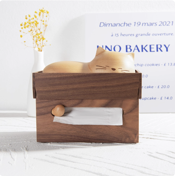 Our journey started with a visit to a quiet wood workshop in China, where a handcrafted wooden tissue box shaped like a cat stopped us in our tracks. Carved from North American walnut and maple, it radiated warmth, intention, and character.